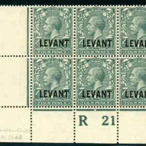 1921 British Levant 4d plate R21 Block of 6 Sg L20 ** / *
