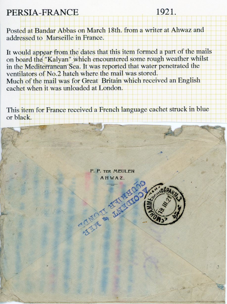 1921 Persia Bander Abbas Kalyan Steamer Disaster Mail to France