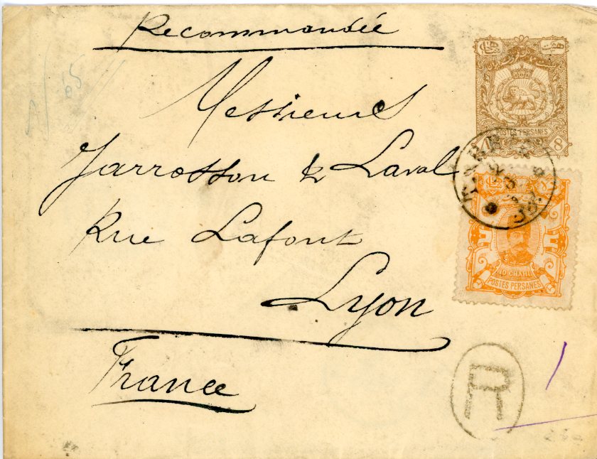 1896 Persia Tabriz 8ch Postal Envelope Registered to Lyon
