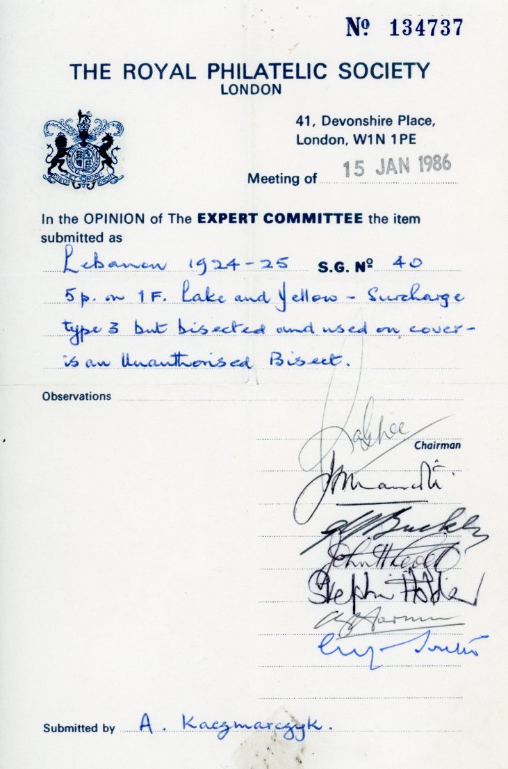 1925 Lebanon Tyre 5p on 1f Bisect RPSL cert ex Kaczmarcyzk