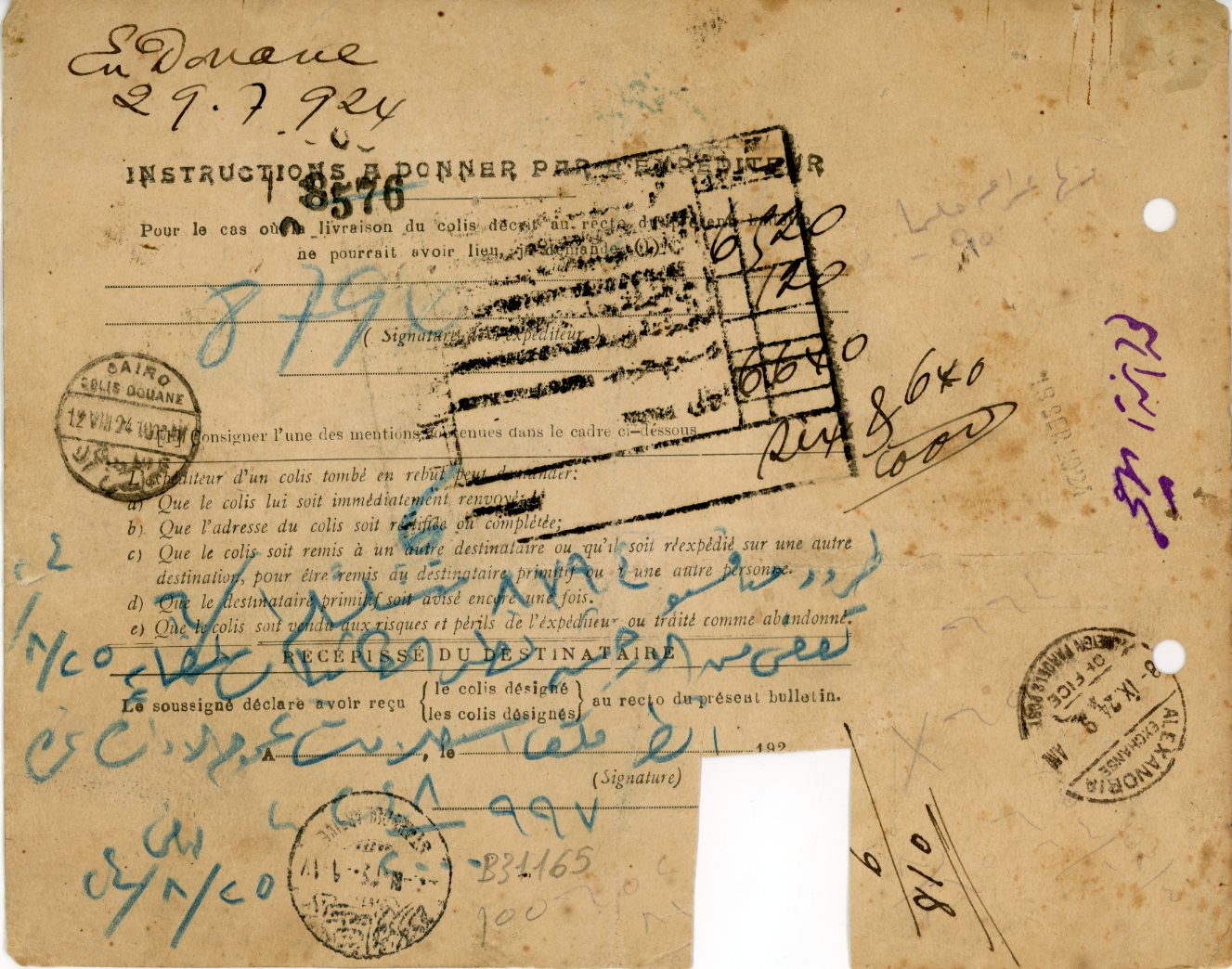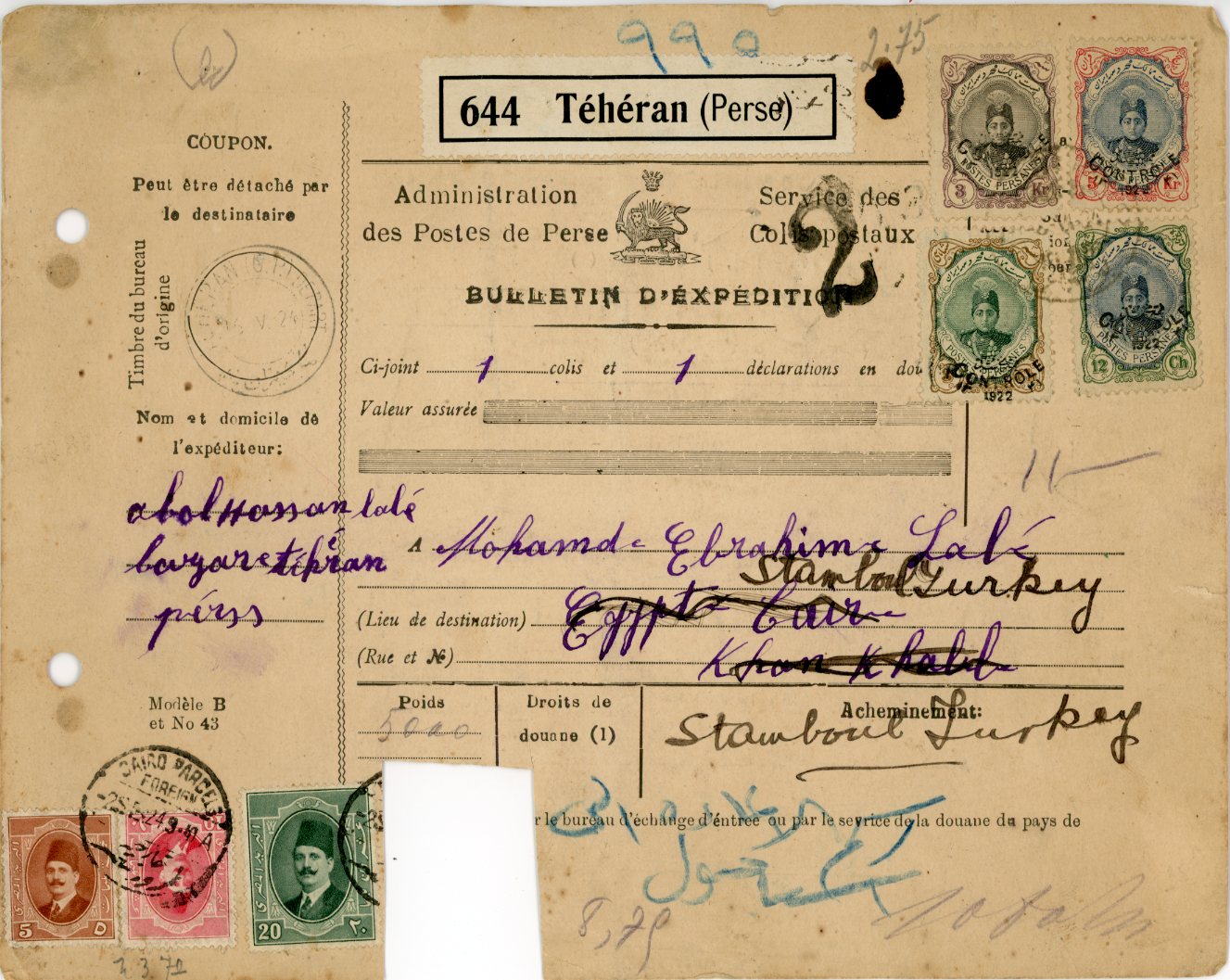 1924 Persia Parcel Card to Egypt redirected to Turkey