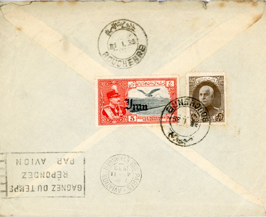 1939 Persia Bushire 5Kr Airmail via Paris to London