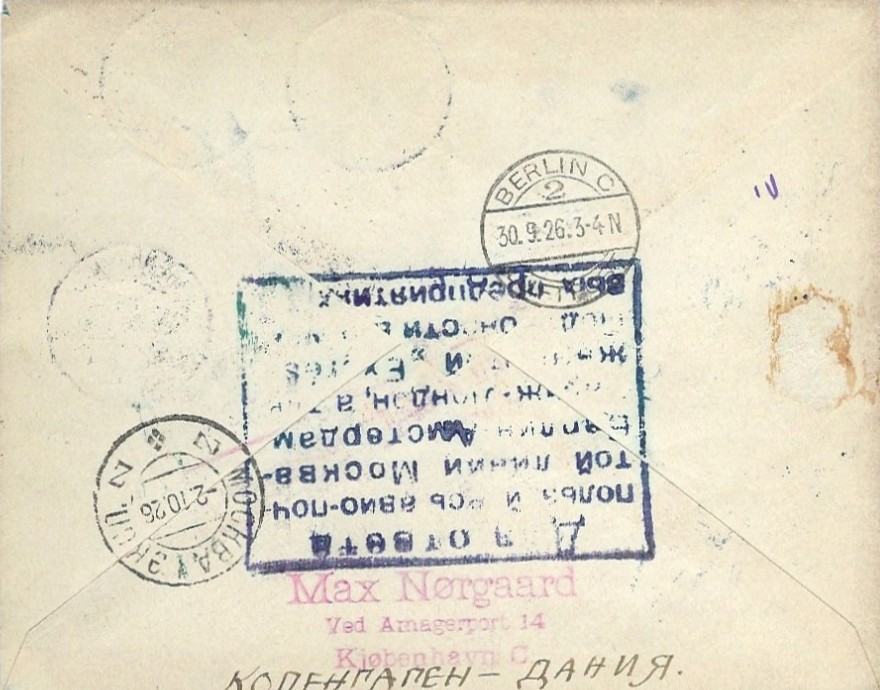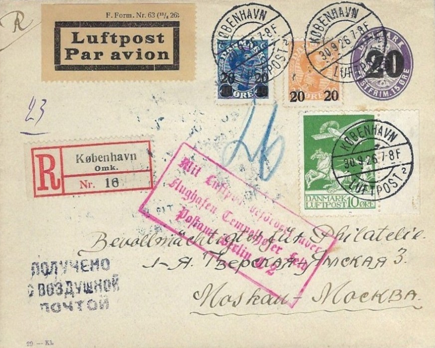1926 Denmark 20 on 150 Registered Postal Card to Moscow