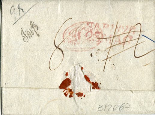 Italy – Greece: 1826 (17 May). Folded entire from Rimini, Italy to Corfu struck on arrival handstamp. Reverse 23 May red handstamp.