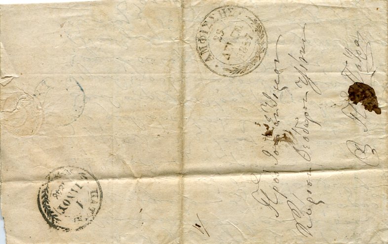 Greece: 1847 (25 December). Folded entire to Patras struck by AMFISSA datestamp. Reverse 1 January 1848 arrival cds and illegible double circle postmark.