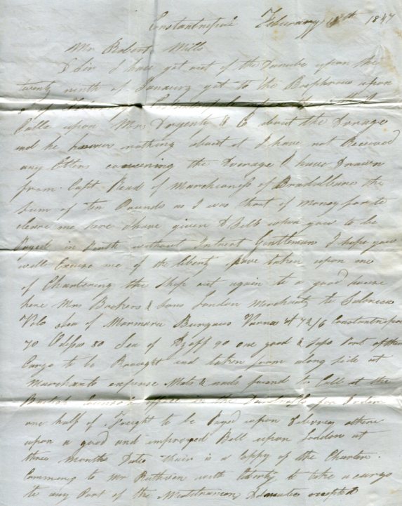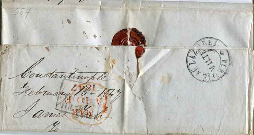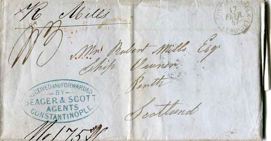 Turkey: 1847 (14 February). Folded complete entire to Scotland struck by 17 February CONSTANTINOPLE (TURQUIE) French Levant datestamp and Seager & Scott forwarding agent cachet. Reverse Malta Lazaretto quarantine station transit and 10 March arrival cachets.