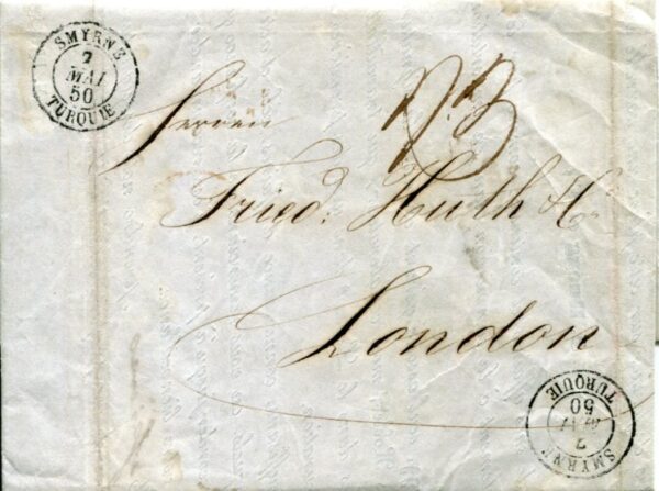 French Levant: 1850 (7 May). Folded commercial complete entire to London struck by SMYRNE TURQUIE datestamps. Reverse 20 May arrival cds and oval merchant cachet.
