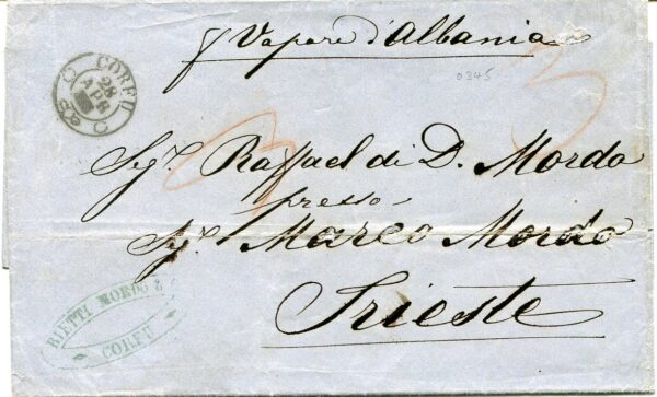 Austria Levant – Greece – Albania: circa 1856 (28 April). Folded commercial entire to Trieste struck by CORFU datestamp, RIETTI MORDO & Co / CORFU merchant cachet, “Vapore d’Albania” by manuscript on top and 3 May Triest arrival cds on reverse. According to 1856 Lloyd lines table, the ship for Trieste left Corfu on a Monday 28 April. The first port of call after was Valona in the Ottoman province of Albania.