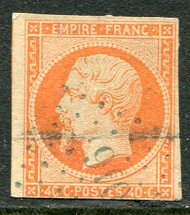 French Levant: 1857 issue 40c Napoleon imperf. struck by (4)016 petit chiffres numeral for TREBIZONDE (Trabzon, Turkey) handstamp. Creased through middle but still very scarce. Sg.65
