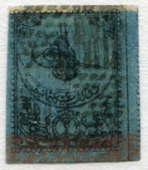 Türkiye: 1862 (December). Tughra type first printing 2 piasters blue with red control band at foot, fine used top marginal. Isfila 1RV03