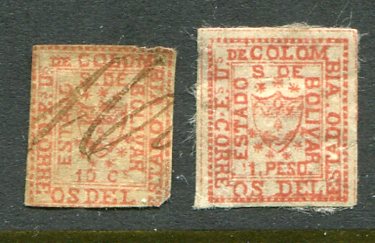 Colombia – Bolivar: 1863 1p. unused and 1866 10c pen cancelled. Sc. 2, 3