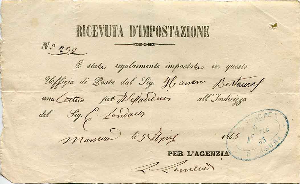 1863 Egypt MANSURA Posta Europea Receipt