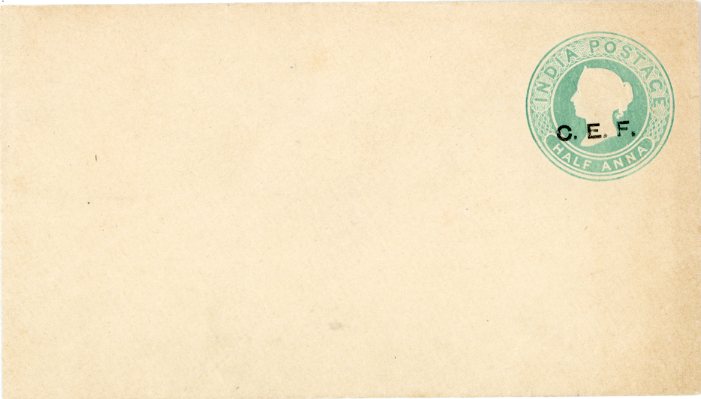 India Used Abroad: Unused 1863 1/2a postal stationery envelope overprinted C.E.F. in black.