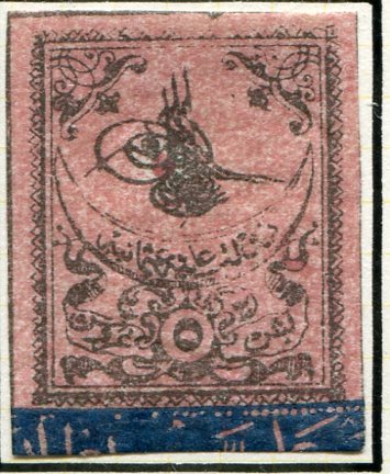 Türkiye: 1863 (12 January). Tughra issue second print 5pi rose red with blue control band at foot small part mint o.g. with partially missing ornaments at top variety. Isfila 6BE069 *