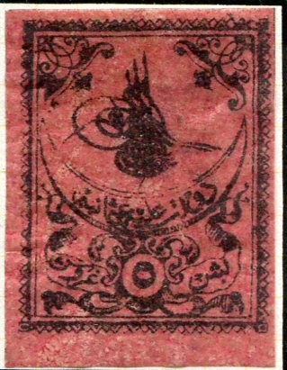 Türkiye: 1863 (12 January). Tughra type second printing 5 piasters carmine without control band large part mint o.g. Isfila 6BV19. *