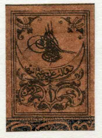 Türkiye: 1863 (12 January). Tughra issue postage due type 1pi red-brown with blue control band at foot unused with broken frame on top left and lower right varieties. Isfila 8. (*)