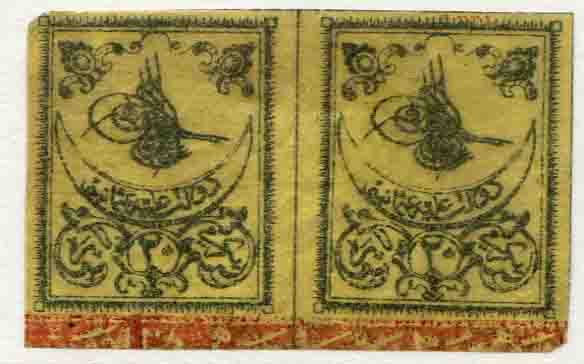 Türkiye: 1863 (12 January). Tughra type second printing 20 paras yellow horizontal pair with red control band at foot, fine used. Isfila 3PV02