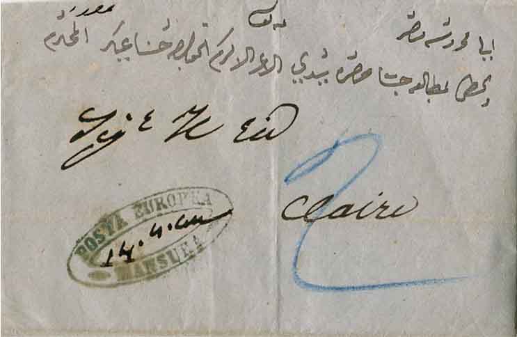 Egypt: 1864 (14 April). Folded complete entire to Cairo struck by type III POSTA EUROPEA – MANSURA handstamp with date inserted by hand. Reverse no postal markings.