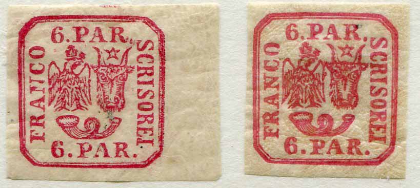 Romania: 1864 printed from plates two 6p white wove paper left marginal without gum and one with gum.