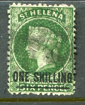 St. Helena: 1864. ONE SHILLING surcharged on 1s. deep yellowgreen perf. 12 1/2 type A (thin bar) struck by part handstamps. Sg. 17