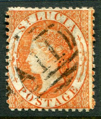 St. Lucia: 1864 QV (1s.) brown-orange wmk. Crown CC perf. 12 1/2 struck by A11 handstamp. Sg. 14