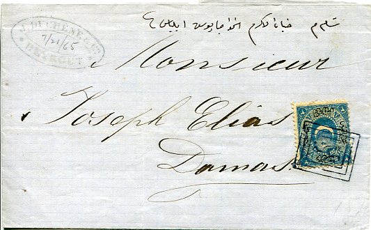 Ottoman Lebanon: 1865 (21 July). Folded commercial entire to Damascus franked with 2pi of 1865 Dulos type stamp for two piastres triple weight (5 dirham=16gr) up to 50 route hours (it was 24 hrs) rate tied by triple box BEYRUT 81 (A&P type 4) handstamp and sender’s handcachet. Reverse no postal markings.