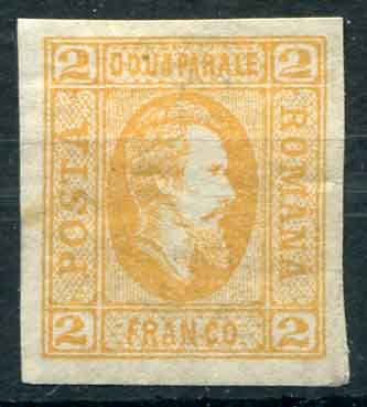 Romania: 1865 (9 January). Prince Cuza issue white vertically laid paper 2p orange imperforate mint large part o.g. Sg49a