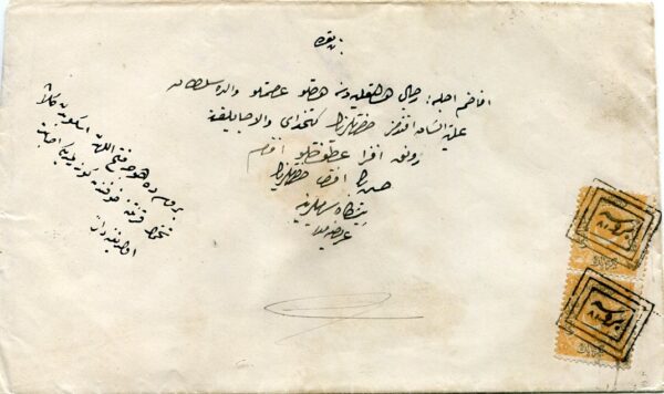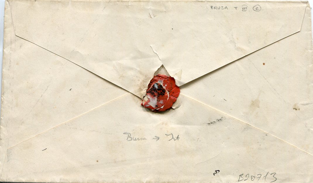 Ottoman Turkey: circa 1865 cover to Istanbul franked with vertical pair of 20pa one with bottom right value scratched variety of 1865 Dulos types single weight 1 piastre 22 route-hours rate struck by superb triple box BRUSA 81 (A&P type 5) handstamps. Any Dulos document with error or variety considered a rarity. ex. Plantinga