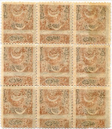 Ottoman Empire: 1865 (13 January). Dulos type postage due 1pi unmounted mint block of nine with design and overprint offset variety. Sg.D19 – Isfila 31BE133. **