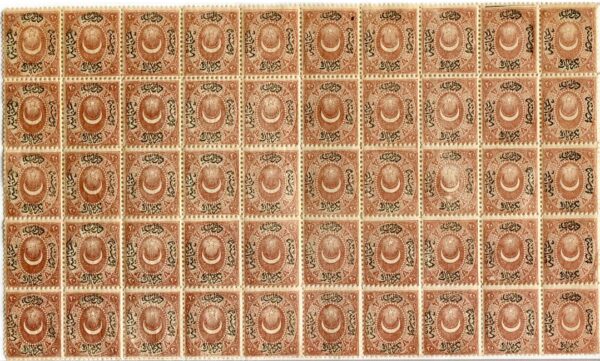 Ottoman Empire: 1865 (13 January). Dulos type postage due 20pa unmounted mint pane of 50 with scratched Arabic zero on lower left (position 39) variety and a black line on top as a result of exchanged damaged cliché which only found in this value. Sg.D18 – Isfila 30BE103. **