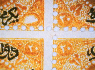 Ottoman Empire: 1865 (13 January). Dulos type 20pa orange-yellow block of four struck by triple box KONYA 81 (A&P type 5) handstamps with scratched value on bottom right value plate flaw. Isfila 22BE097.