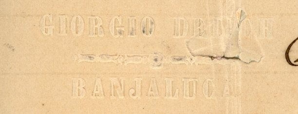 Bosnia: 1866 (29 March). Folded complete entire on GIORGIA DEMICH * BANJALUCA embossed paper to Trieste. It was taken across the border where franked with 5kr. perf. 9 1/2 tied by 3 April ALT GRADISKA (now Stara Gradiška, Croatia) datestamp. Reverse 5 April Sissek (now Sisak, Croatia) transit and same day arrival cds.