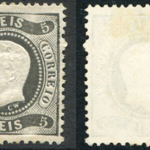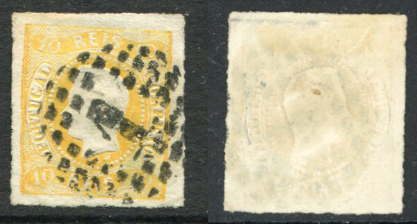 Portugal: 1866 King Luis 10r. yellow with dotted ‘1’ cancellation. Sold as official reprint.