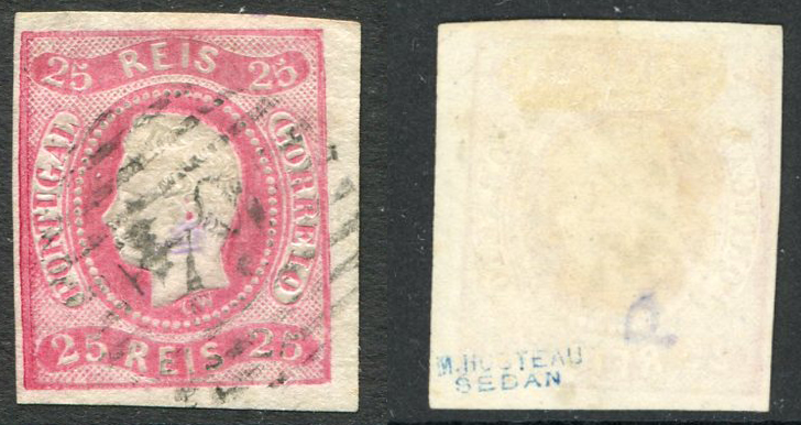 Portugal: 1866 King Luis 25r. rose with dotted ’79’ cancellation. Sold as official reprint. signed