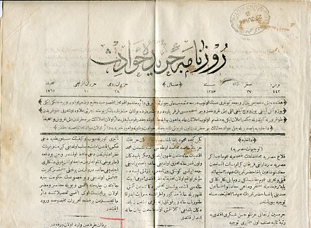 Ottoman Turkey: 1866 (27/28 July). Folded double sided Ruzname-i Ceride-i Havadis (Daily News Paper) Ottoman Turkish newspaper posted in Istanbul struck by part Galata dispatch and BOYACI KÖY – BOJACI KIOYI (unrecorded by A&P) 29 July arrival datestamp. This is the first daily newspaper printed in Ottoman Turkish. Small tear over cancellation.