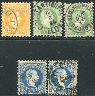 Austria Levant: 1867-78 Franz Joseph portrait perf. 9 1/2 coarse printing 2s, fine printing two 3s and two 10s, all struck by part or full Lloyd Agenzie Constantinopel datestamps. Scarce group. Mi. 1Ia, 2IIA, 4IIa – Sg. 1, 9, 11