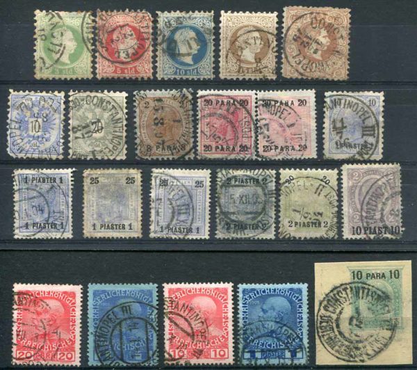 Austrian Levant: Post offices in the Turkish Empire 1867-1908 issues struck by various types of (LLOYD) CONSTANTINOPEL (I, II, III) or LLOYD CONSTANTINOPOLI (Istanbul, Turkey) datestamps. Scarce selection inc. some scarce values and a postal statiionery cut-out.