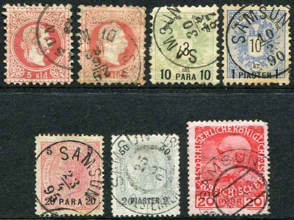 Austrian Levant: Post offices in the Turkish Empire 1867-1908 issues struck by various types of SAMSUN (Turkey) datestamps.
