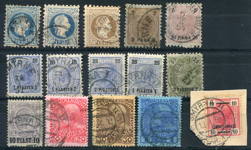 Austrian Levant: Post offices in the Turkish Empire 1867-1908 issues struck by various types of SMIRNE or SMYRNA I or II (Izmir, Turkey) datestamps.