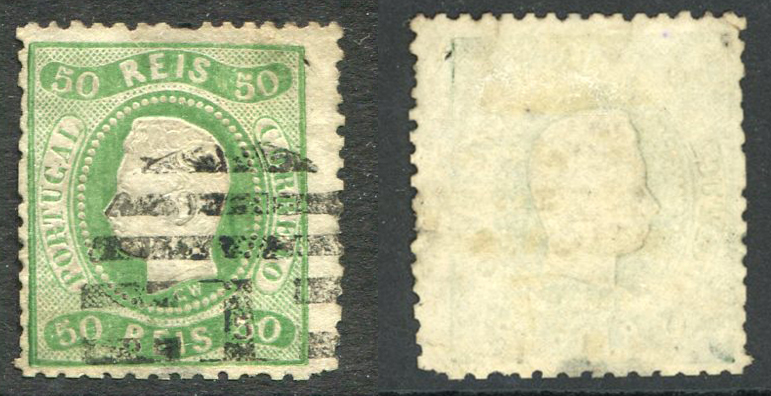 1867 King Luis 50r. green perf. 12 1/2 used. Faults