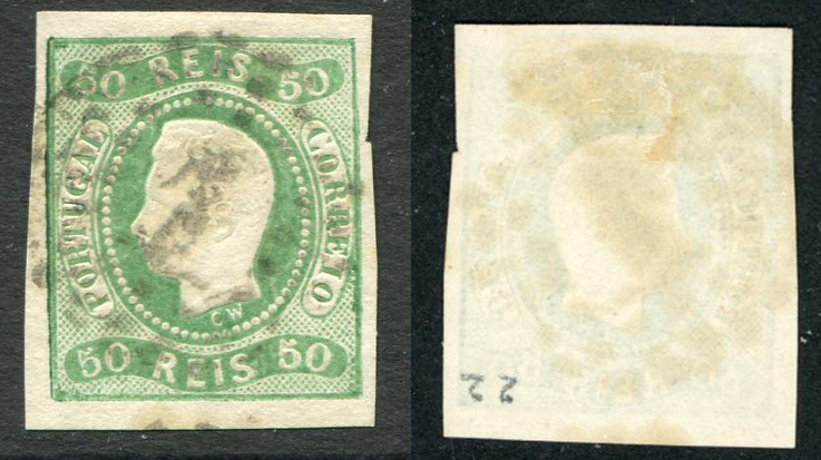 Portugal: 1867 King Luis 50r. green with dotted cancellation. Sold as official reprint.