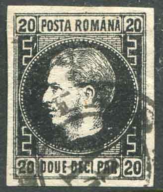 Romania: 1867 (1 February). Prince Carol issue thin paper 20p black / light rose reverswe Greek border type imperforate fine used. Sg64