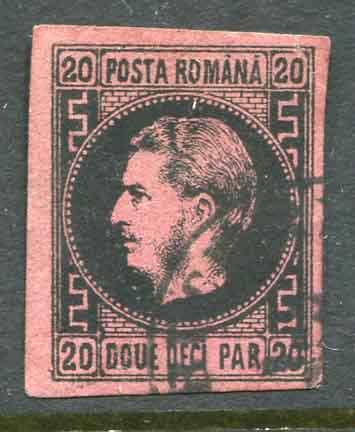 Romania: 1867 (1 February). Prince Carol issue thin paper 20p black / deep rose imperforate fine used. Sg62