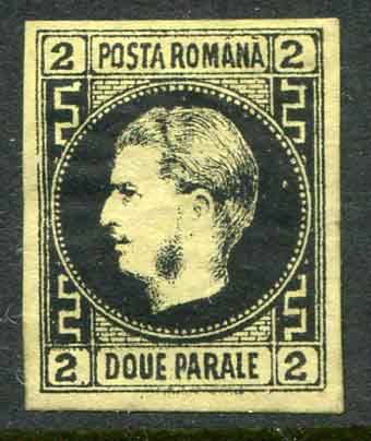 Romania: 1867 (1 February). Prince Carol issue thin paper 2p black / yellow imperforate large part mint o.g. Sg60