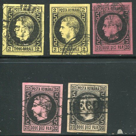Romania: 1867 (1 February). Selection of Prince Carol I thin paper imperf stamps 2p and 20p, all with Forge Cancellations. Some with expert/owner marks on reverse.