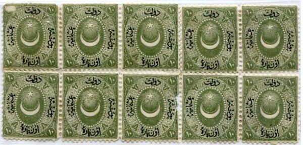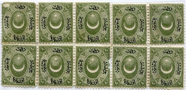 Türkiye: 1867 prepared for use but not unissued Dulos type 10pa mint o.g. or unmounted mint re-joined block of ten with a scratched value on top left variety. Unrecorded variety by the specialised catalogue. * / **