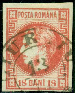 Romania: 1868 (20 Jan). Prince Carol new currency white wove thick paper imperforate 18b rose, very fine used. SG 67