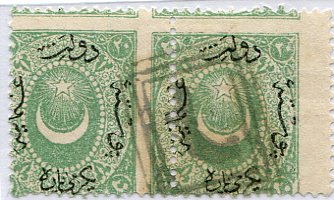 Türkiye: 1868 (28 October). Dulos type 20pa perf. 13 1/2 pair with misplaced perf. variety struck by triple box HAMA (A&P type 1) handstamp. Sg 36, Isfila 47DE10
