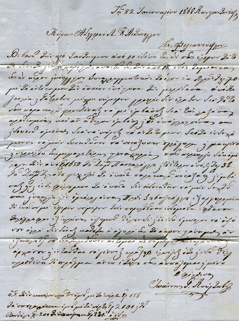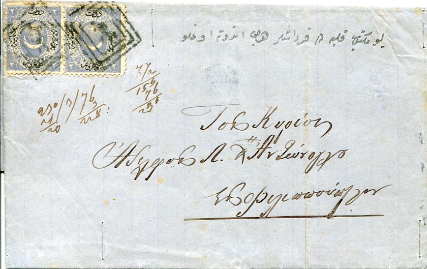 Ottoman Turkey – Bulgaria: 1868 (22 January). Folded complete entire to Filibe (Plovdiv, Bulgaria) franked with Dulos type pair of 2pi issue of 1867 for four piastres 4 dirham weight and 78 route-hours rate (20pa short) tied by triple box DERALIYYE 81 (A&P type 22) handstamps.  Isfila 31 – Sg. D19