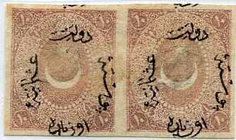 Türkiye: 1868 (28 October). Dulos type 10pa dull purple unused imperforate pair with misplaced overprint variety. Thinned at bottom. Unrecorded by the specialised catalogue. Sg 35, Isfila 46DE11. (*)